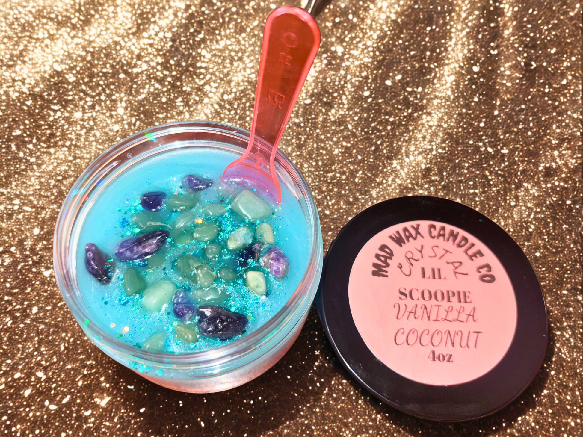 4oz of Scoopable HIGHLY Scented Soy Wax. Comes in a Plastic Jar with Screw on Lid & a Little Spoon to Scoop With! Topped with Crystal Chips (Wax Color & Glitter Varies With Scent)
