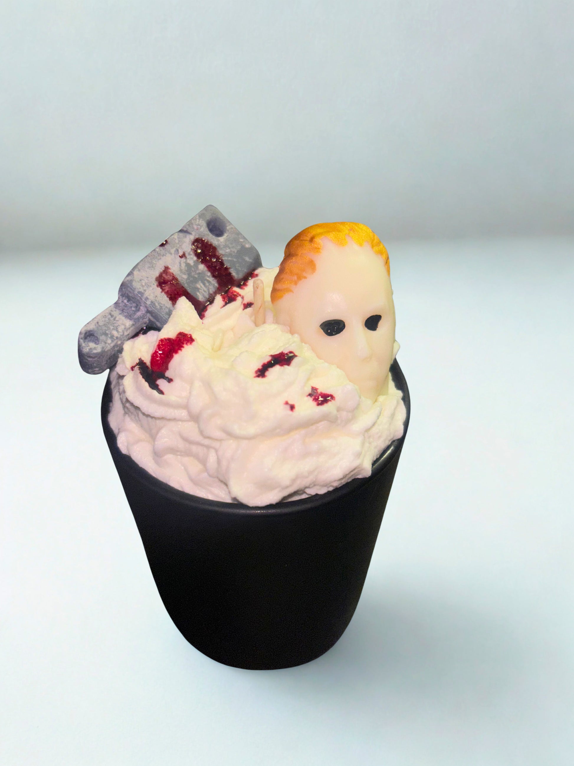 Coconut&Soy Candle in Black Glass Jar with Wooden Lid. Whipped wax on top with a Micheal Myers Wax Head